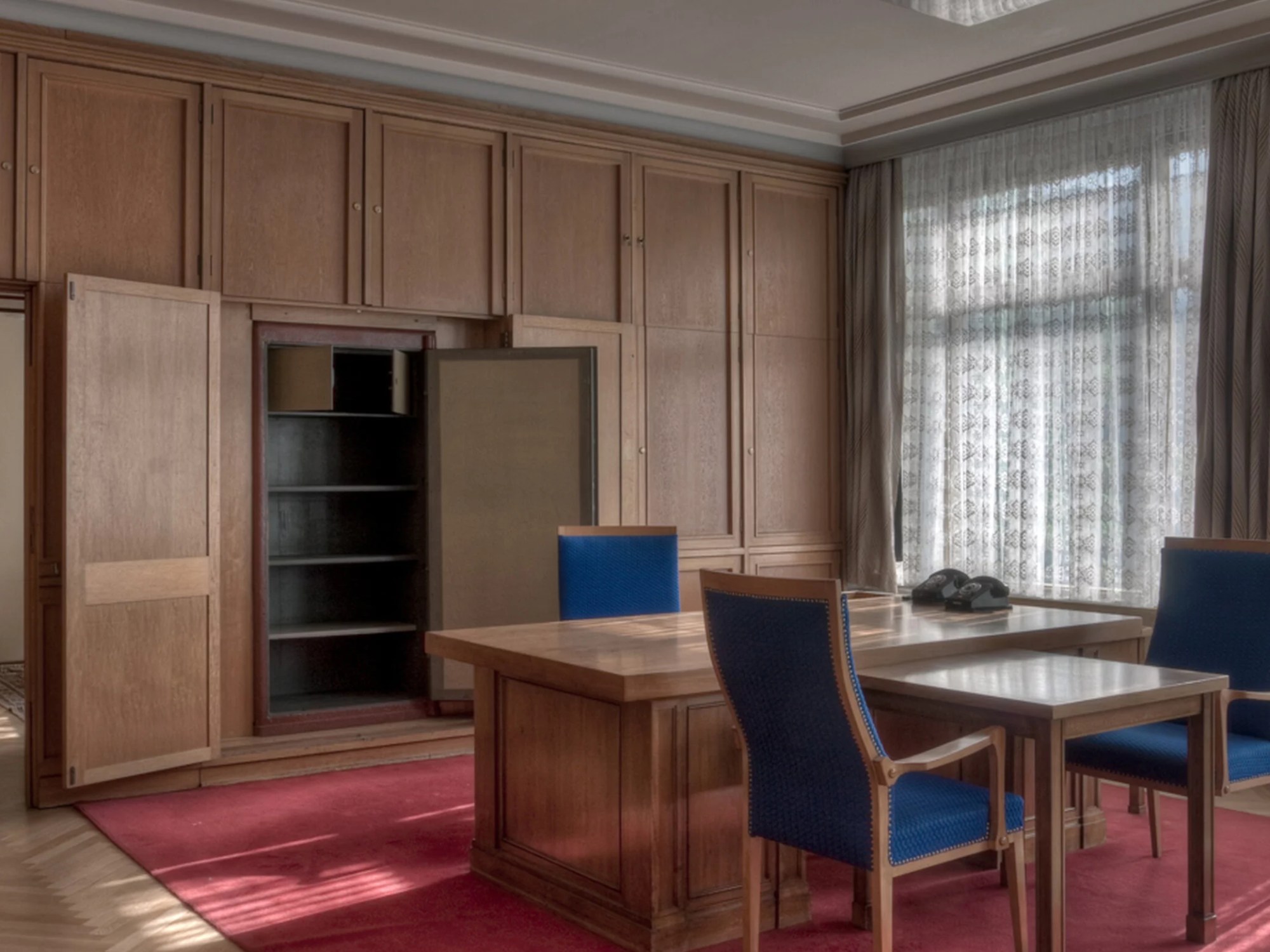 Le masque mortuaire de Lénine sur le coin du bureau – plâtre mat, yeux clos, impassibilité, indifférence des défunts. Immense bureau en bois clair, ciré, brillant miroir. Sous-main en cuir, empreinte des coudes en léger creux. Pas un stylo, pas un dossier – tout dans la tête. Peut-être que le contenu des tiroirs, les trombones tordus, les crayons mâchonnés, peut-être que tout a été envoyé aux archives du sous-sol, peut-être que tout a été brûlé ou mis à l’abri en attendant des jours meilleurs – peut-être que tout est parti avec le chef enterré dans le carré des Socialistes du cimetière de Friedrichsfelde.